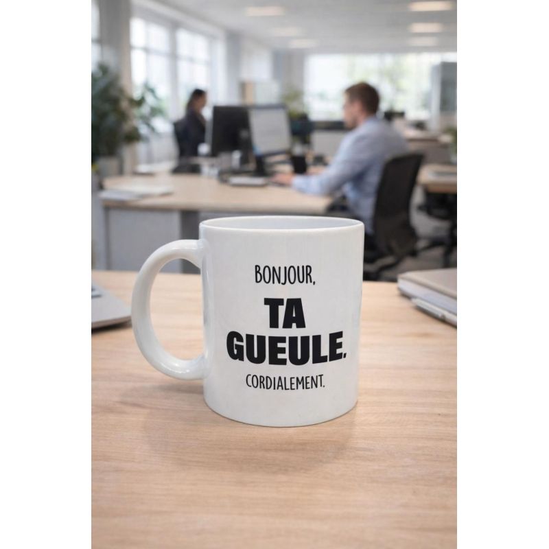 Mug humoristique « Bonjour, ta gueule, cordialement » : parfait pour ton café du matin avec une touche de sarcasme et beaucoup de style.
