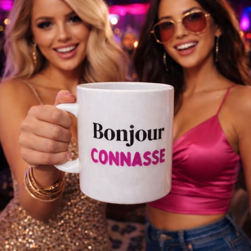 Avec son inscription « Bonjour Connasse » en rose, ce mug joue la carte du contraste : un ton volontairement provocateur adouci par une couleur douce et féminine. Résultat ? Une tasse qui fait sourire (ou lever un sourcil) dès la première gorgée.