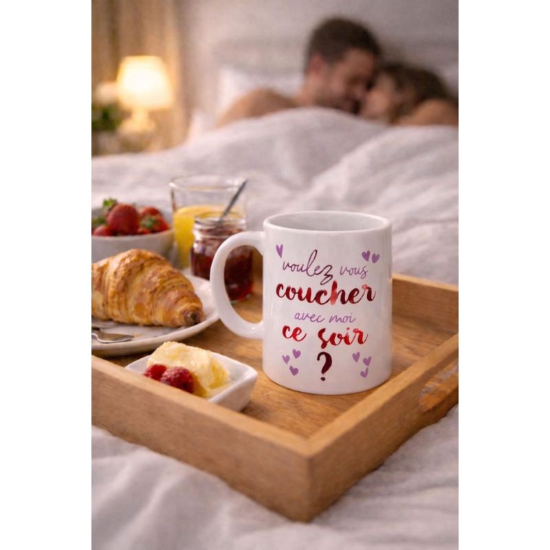 Mug humoristique romantique avec message drôle "Voulez-vous coucher avec moi ?" décoré de petits cœurs, parfait pour offrir un cadeau original et plein d'humour et d'amour ...