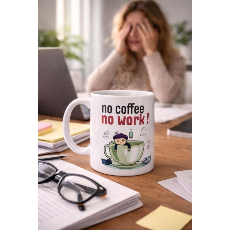 Pour certains, la journée commence avec un bon café. Pour d’autres … elle ne commence tout simplement pas sans café ! Ce mug « No Coffee No Work » accompagné d’un dessin humoristique résume parfaitement l'état d’esprit de nombreux amateurs de café.