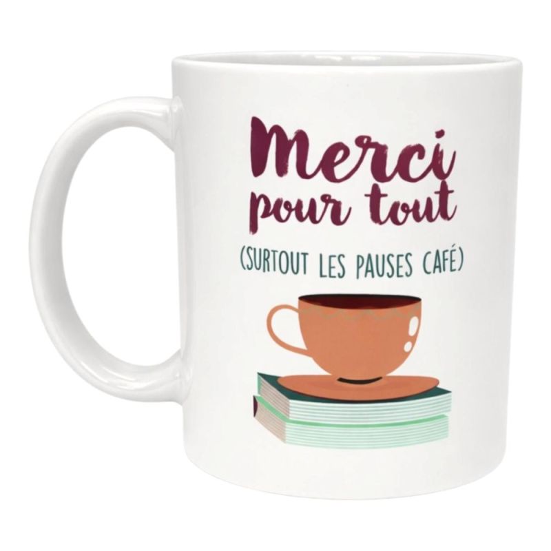 Un mug « Merci pour tout, surtout les pauses café », parfait pour remercier un collègue ou un ami avec humour.