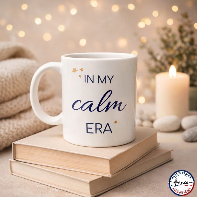 Envie de ralentir et de profiter pleinement de l'instant présent ? Le mug In my calm era avec ses petites étoiles jaunes incarne parfaitement cet état d'esprit apaisé et positif.