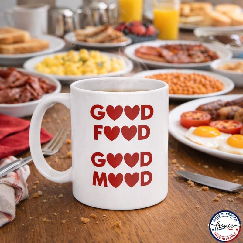 Le mug Good Food Good Mood avec ses petits cœurs rouges transforme chaque pause en sourire et bonne humeur.