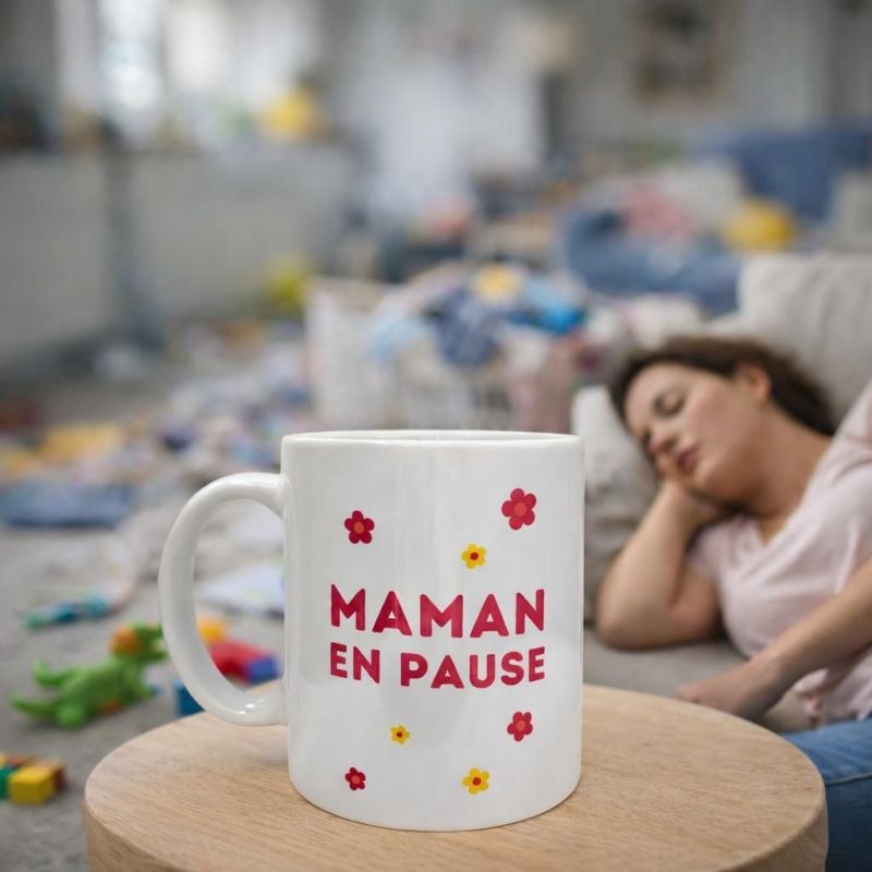 Un mug tout doux pour les mamans qui méritent une pause ! Avec son message Maman en pause et ses petites fleurs rouges et jaunes, il apporte tendresse et sourire au quotidien.
