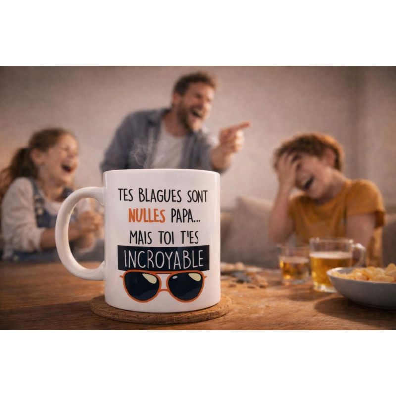Le mug Tes blagues sont nulles Papa, mais toi, tu es incroyable fait sourire et touche en plein cœur.