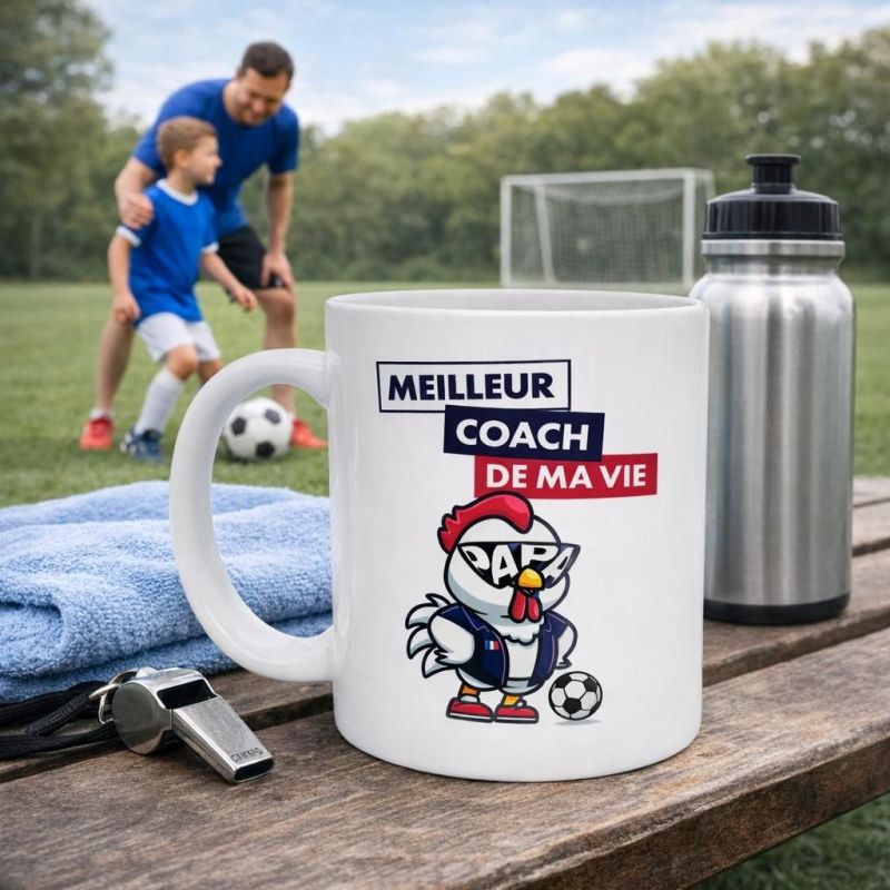 Un mug pour les papas fans de foot ! Avec son message Meilleur Coach de ma vie et le coq déguisé en entraîneur, il transforme chaque pause café en moment fun et motivant.