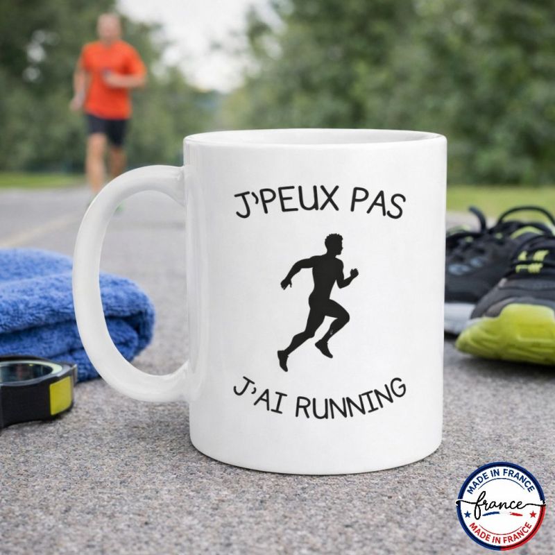 Tu regardes ton mug “J'peux pas, j'ai running”, tu verses ton café … et tu souris.